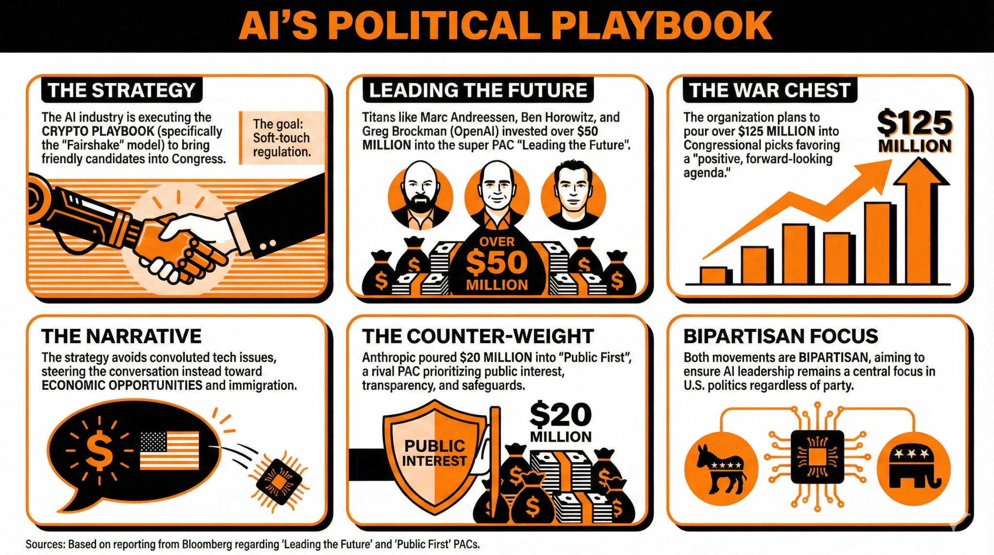 According to Bloomberg, AI titans like Marc Andreessen, Ben Horowitz, and OpenAI co-founder Greg Brockman have invested over $50 million to support candidates with a soft-touch regulation stance on AI through a super PAC denominated Leading the Future.