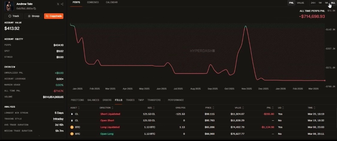 Andrew Tate loses $286,000 in crypto shorting oil