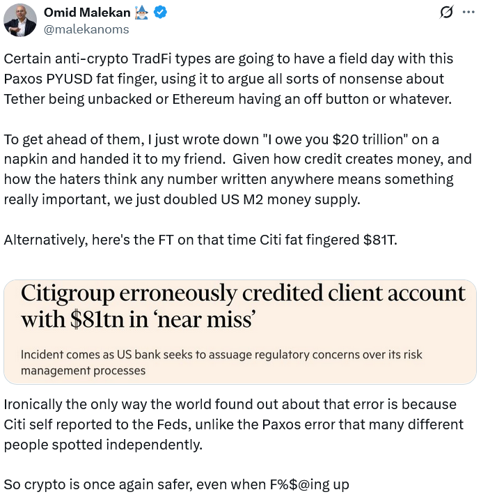 Paxos’ accidental minting of $300 trillion PYUSD on Wednesday, while undoubtedly concerning, serves as a case study as to why blockchain could shine in traditional banking.