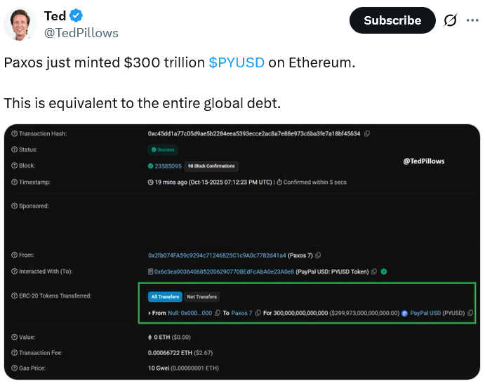 On Wednesday, Paxos mistakenly minted $300 trillion worth of the PayPal USD (PYUSD) stablecoin, describing it as an “internal technical error.”
