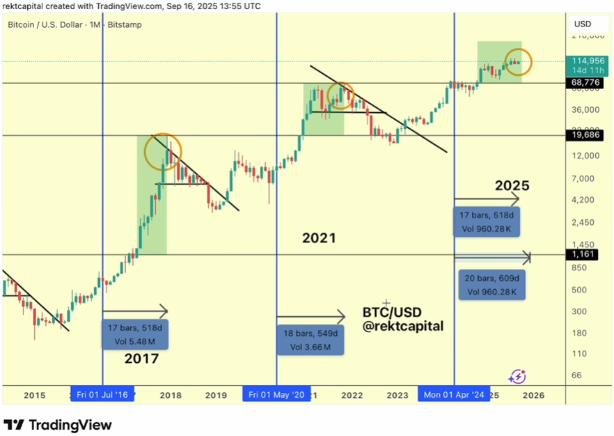 Bitcoin is entering what analyst Rekt Capital calls the ‘banana zone,’ the parabolic phase of its market cycle. This is the stage where prices typically rise sharply, but with smaller pullbacks than earlier in the cycle.