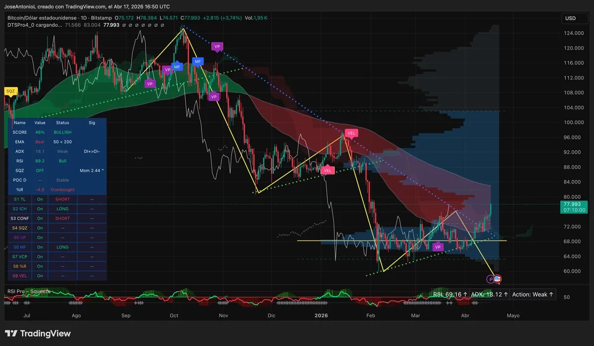 The cryptocurrency’s rise today was triggered by an unexpected geopolitical event: Iran declared that the Strait of Hormuz would remain open during the ongoing ceasefire, which led to falling oil prices and increased interest in risk assets. Following this announcement, Bitcoin briefly surpassed $78,000 before experiencing a slight pullback; meanwhile, digital asset treasury stocks like Strategy surged over 10%, as $BTC‘s ascent helped their holdings recover from previous losses.