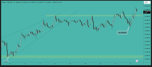 Despite prevailing bullish sentiments though there’s an important cautionary note for traders included in their analysis—the critical threshold at around $117,300 must be monitored closely; any substantial rejection here might lead price action back down toward support levels around $113,300.