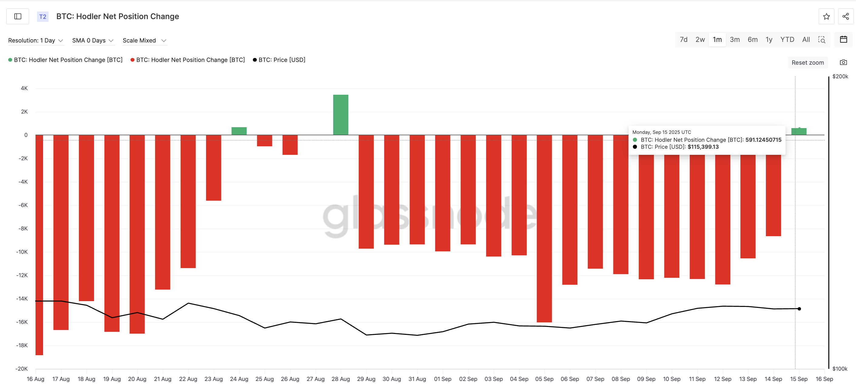 What makes this unusual is that long-term holders have also stepped in. The Hodler net position change metric, which shows the supply held by long-term investors, flipped from –8,652 BTC to +591 BTC between September 14 and September 15, exactly as the price pattern began shaping up. More about the bullish pattern later in the piece.