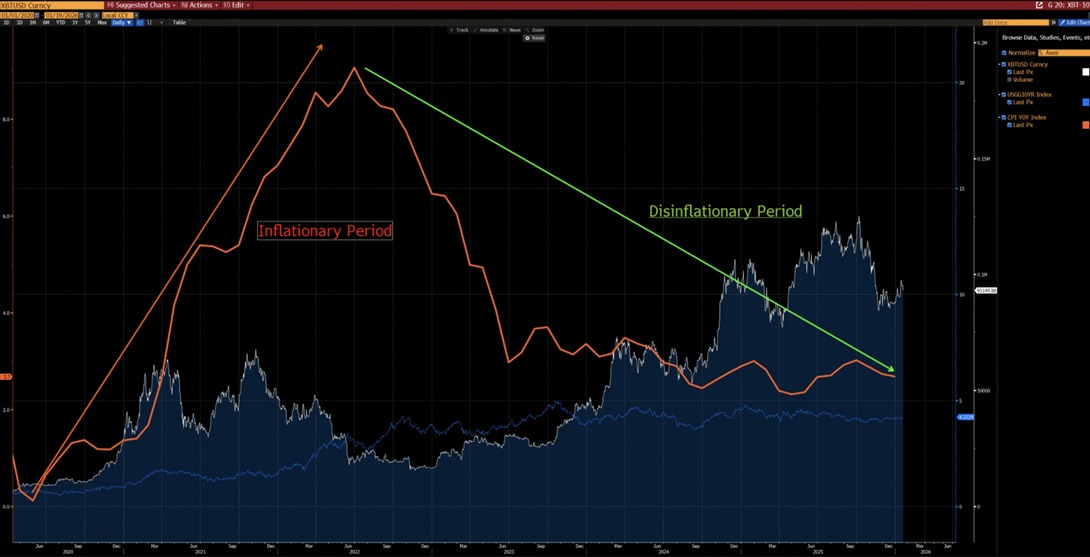 However, Garrett points out that today’s scenario largely reverses this trend: inflation pressures have eased considerably while U.S. risk-free interest rates are trending downward as central banks begin reintroducing liquidity into markets gradually. Historically since 2020, Bitcoin tends to struggle when inflation rises but performs better during periods of declining inflationary pressure—and closely tracks overall U.S. liquidity levels where looser money supply benefits its price action.
