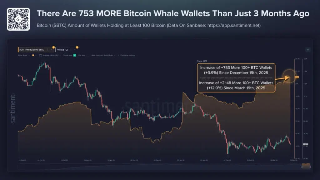 On-chain analytics reveal that the number of Bitcoin wallets holding over 100 coins has increased by 753 in the past three months.