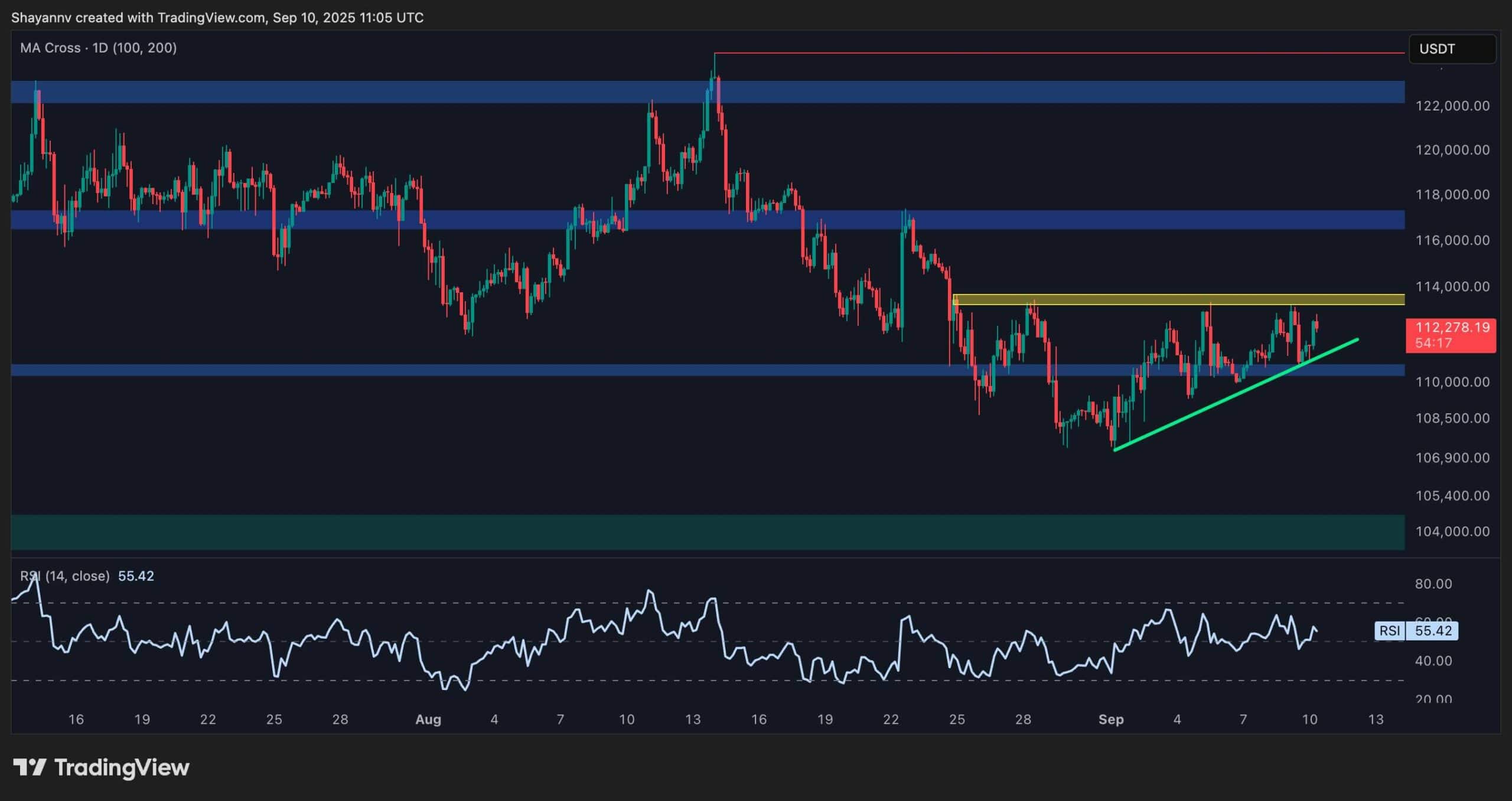 The analysis from the 4-hour chart shows that prices are consolidating within an ascending triangle formation characterized by higher lows forming near $110K and resistance capped at approximately $114K. With an RSI reading of 55 suggesting slight bullish momentum favoring buyers, confirmation for breakout remains pending.