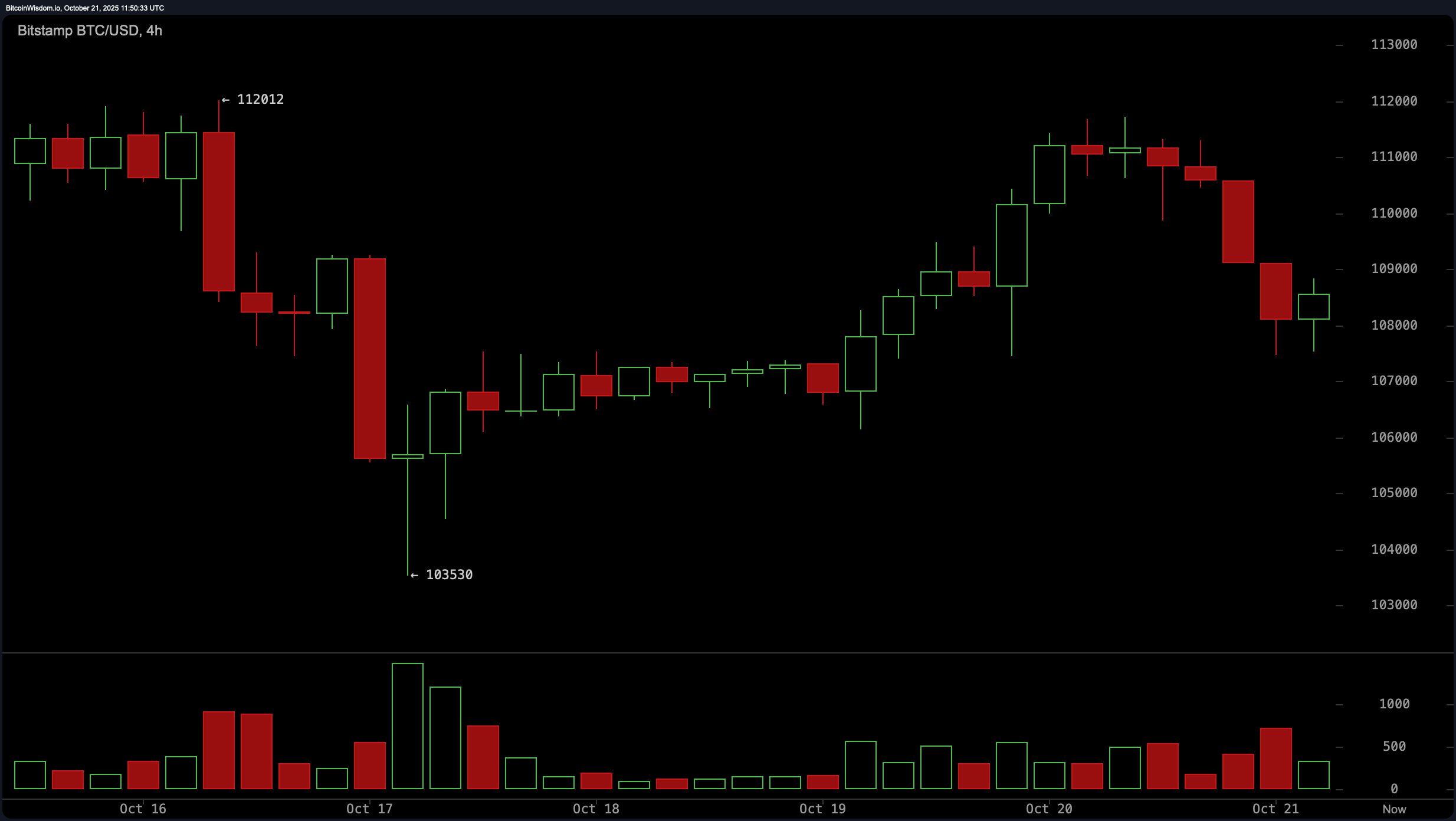 BTC/USD 4-hour chart on Oct. 21, 2025, via Bitstamp.