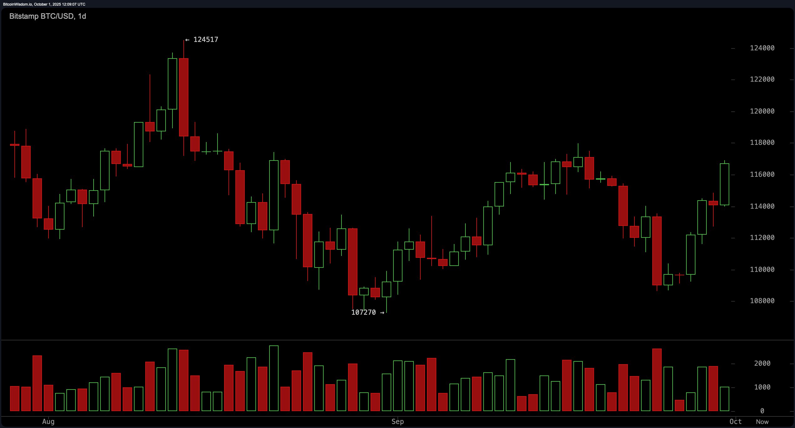 The daily chart reveals bitcoin is toeing the line just beneath a stubborn resistance level in the $117,000–$118,000 zone, a ceiling it last flirted with in early September. A series of higher lows since the recent $107,270 bottom hints that momentum is building for a potential breakout.
