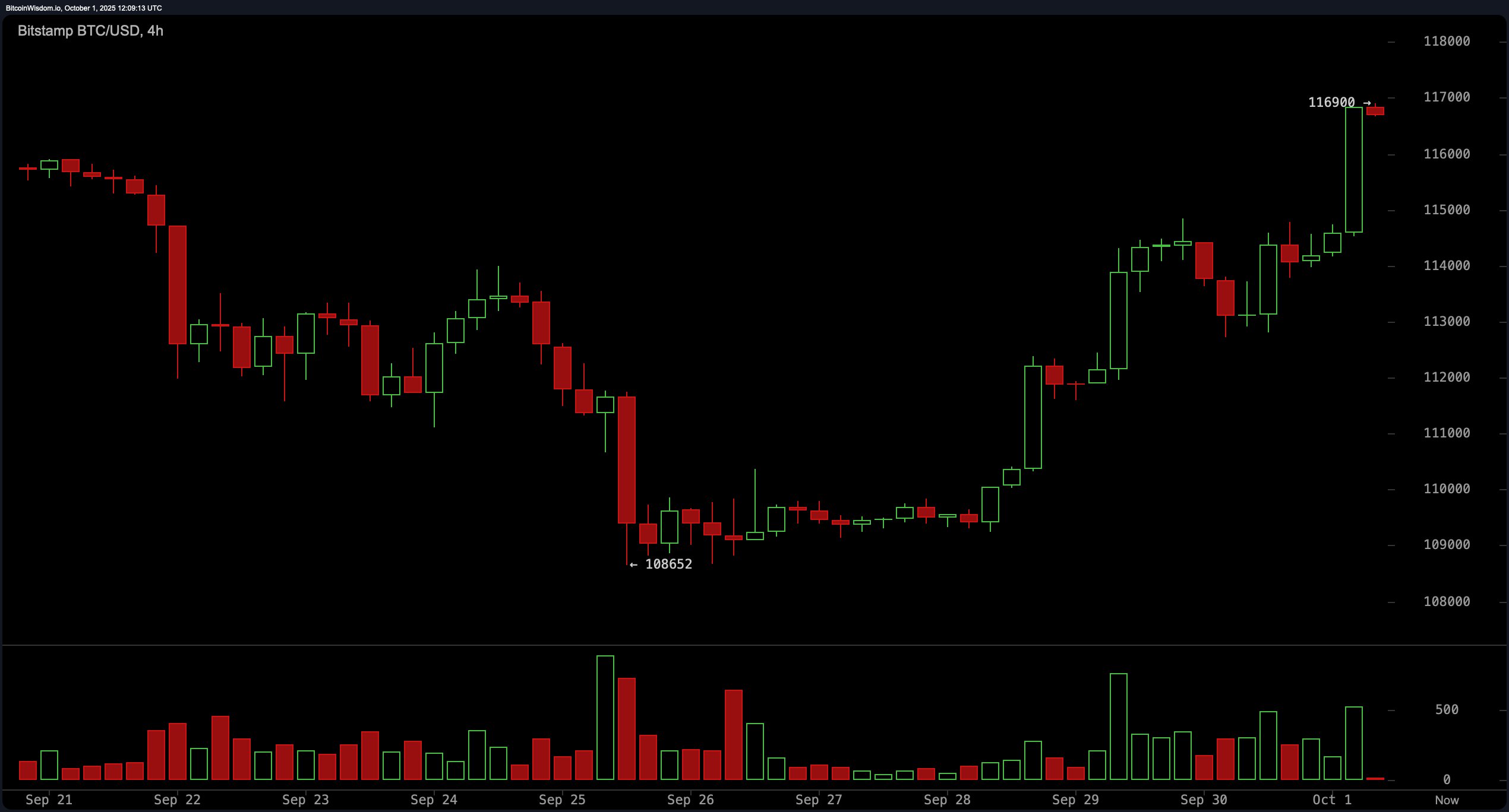 Zoom into the 4-hour chart, and bitcoin’s been flexing harder. A rounded bottom formed between September 25 and 28 has morphed into a sharp impulse breakout, marked by a strong candle punching up to $116,839. This isn’t your average drift upward—it’s a clean structure of higher lows and higher highs, suggesting the smart money’s been accumulating. If this pace holds, short-term watchers will have their eyes fixed on the $117,500–$118,000 window, which now doubles as both battleground and gateway.