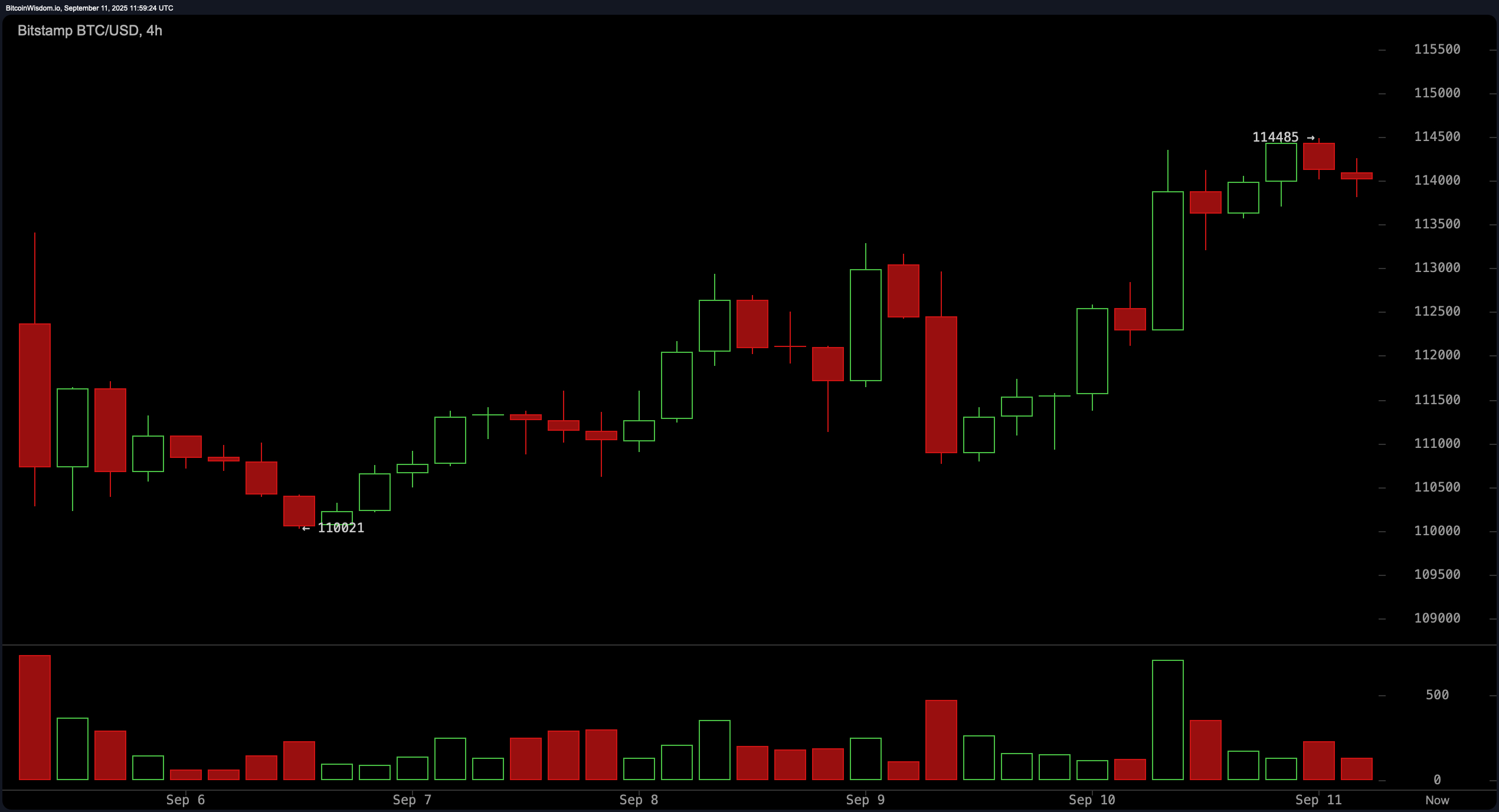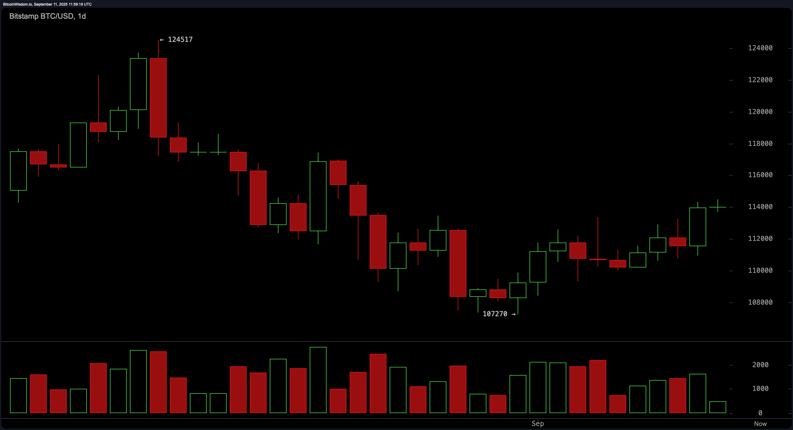 Bitcoin traded at $114,011 on Sept. 11, 2025, bolstered by a market capitalization of $2.27 trillion and a 24-hour trading volume of $48.11 billion. The day’s intraday price range spanned from $112,255 to $114,451, indicating tight consolidation within a key resistance zone.