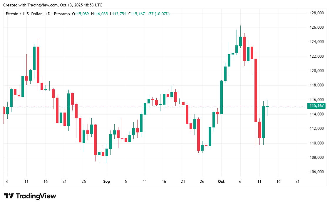 Bitcoin experienced a modest rise on Sunday after U.S. President Donald Trump softened his aggressive stance regarding the trade conflict with China. By Monday afternoon, the digital currency had recouped approximately 46% of its losses from Friday and was trading slightly above $115,000 at the time of writing.