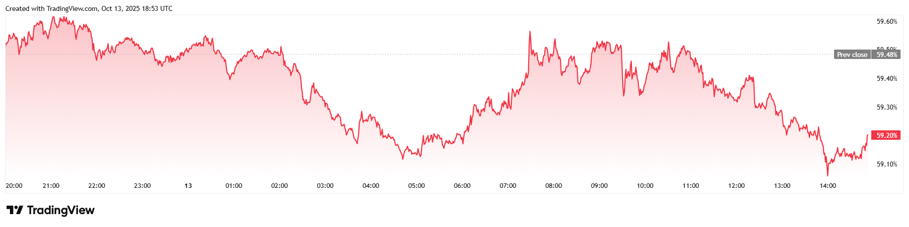 The trading volume over twenty-four hours dropped -7.9% reaching $&#&56;&.&#;13 billion contrary to typical post-weekend volume surges observed on Mondays;. Meanwhile;, market capitalization grew + #;1 percent totaling &36&&38&&38;;2&period29 trillion aligning with daily price growth&period However&comma Bitcoin dominance fell &minus0&period54 percent standing at &59&&period20 percent during reporting time.