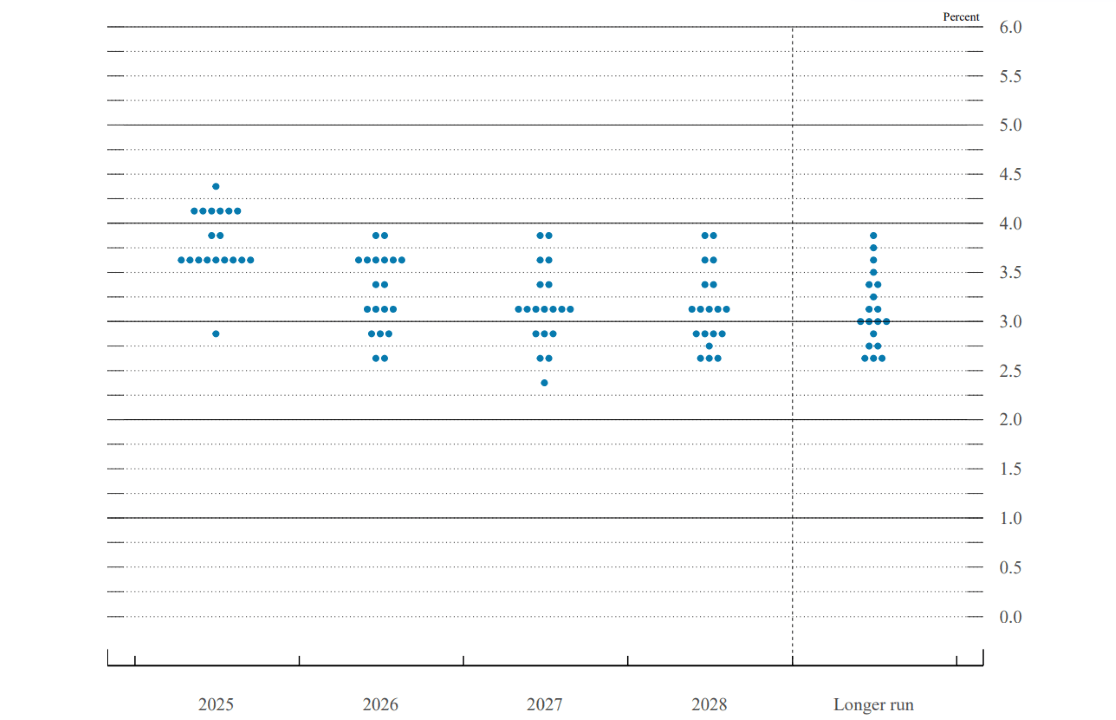 (The “dot plot” illustrates individual interest rate projections from members of the Federal Open Market Committee (FOMC) as well as presidents from each Federal Reserve Bank / federalreserve.gov)