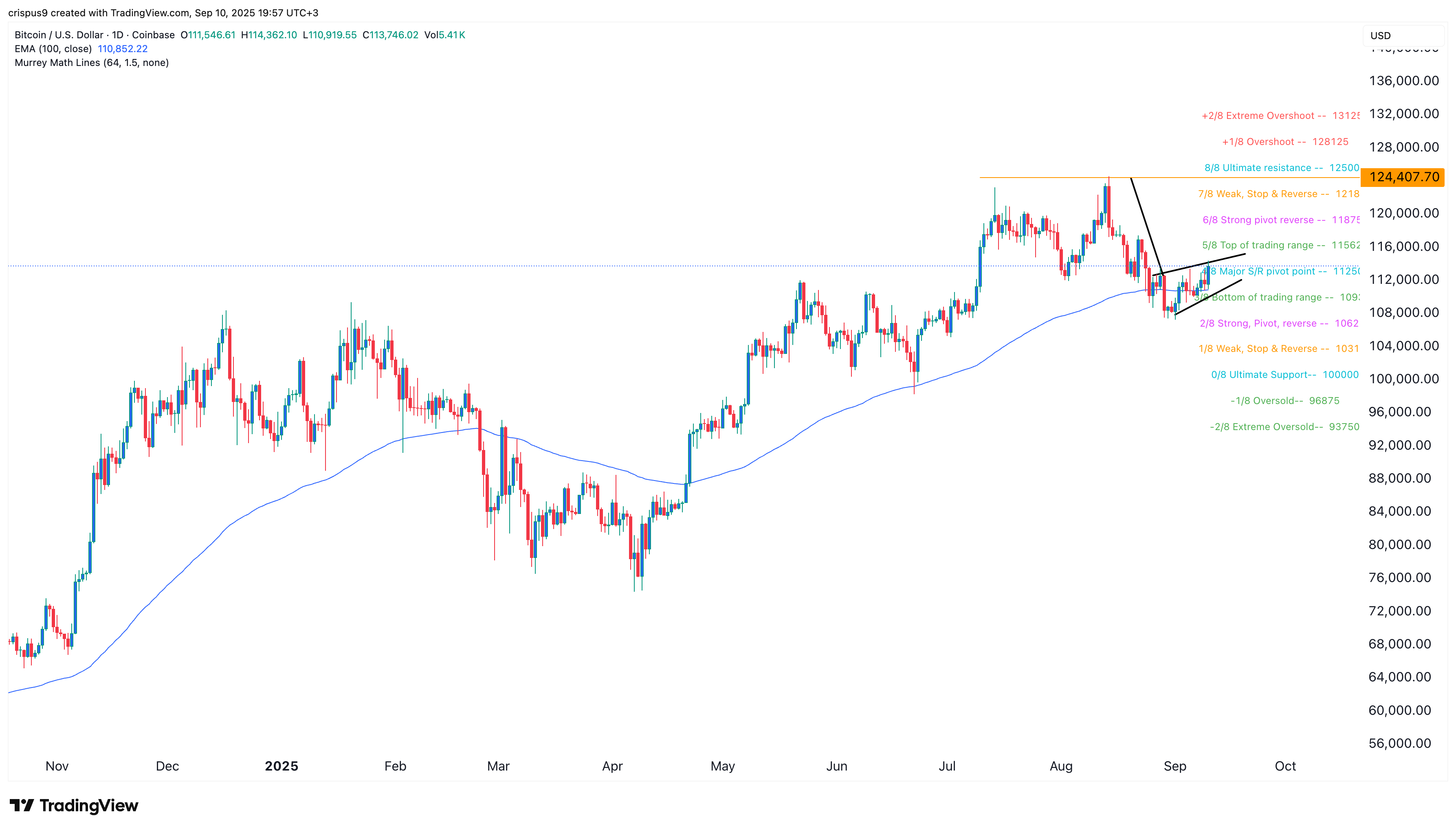 Moreover,BTC has reached key support/resistance pivot points based on Murrey Math Lines suggesting it may retreat soon towards strong support around $100K.