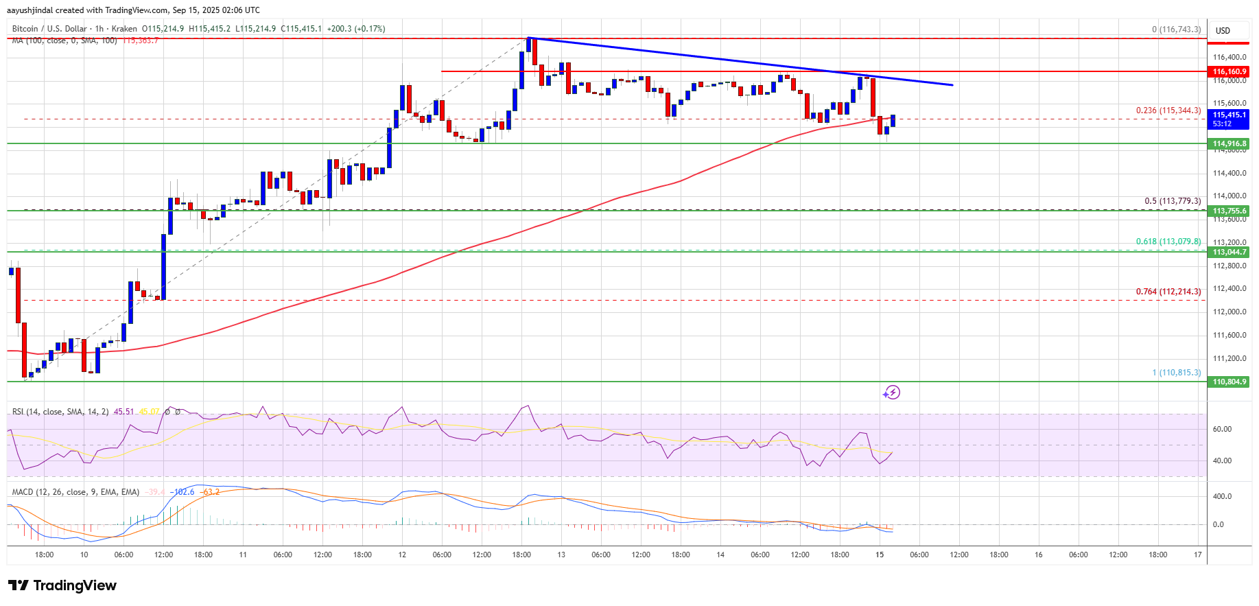 Bitcoin has initiated a new upward movement beyond the $115,000 mark. The current trading price hovers around this level and aligns with the 100-hour Simple Moving Average. Additionally, there is a bearish trend line emerging with resistance positioned at $116,000 on the hourly chart for the BTC/USD pair (data sourced from Kraken). If this pair breaks through the $116,200 threshold, it could trigger another surge.