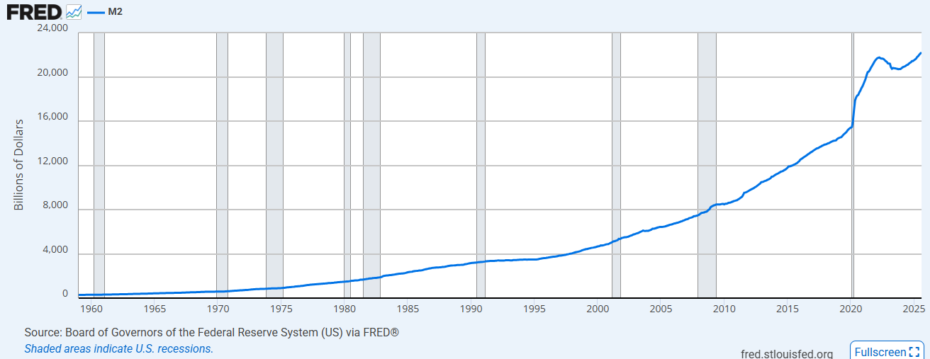 The M2 money supply in the USA follows worldwide trends, serving as a driver to all markets. | Source: Federal Reserve.