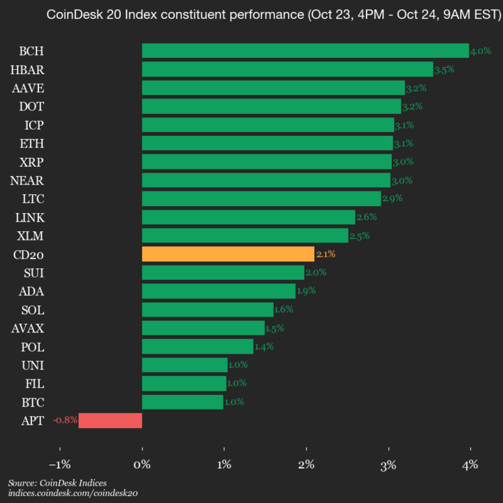Leaders: BCH (+4.0%) and HBAR (+3.5%).