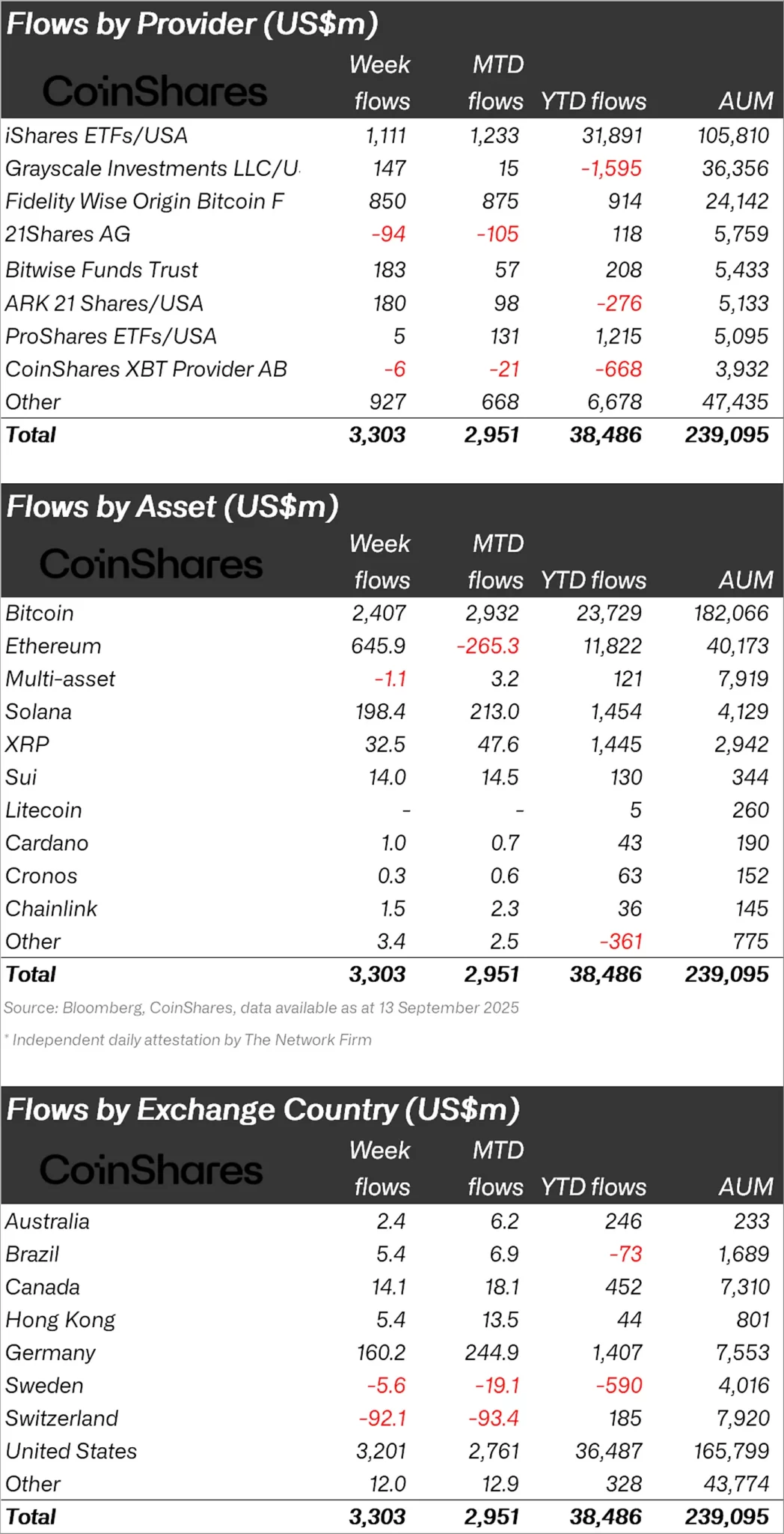 “Cryptocurrency investment products saw $3.3 billion inflows, while asset management assets rose to $239 billion, close to a record high in August.”