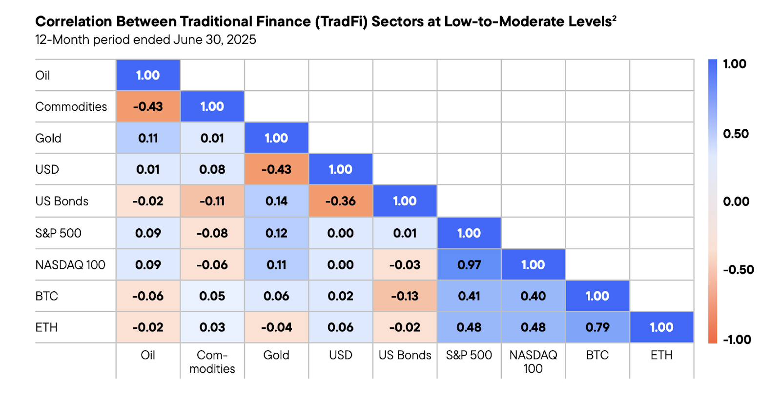Bitcoin and Ethereum also show low correlations with traditional assets, indicating their potential as portfolio diversifiers. Bitcoin has a correlation of 0.41 with the S&P 500, 0.40 with the NASDAQ 100, and 0.06 with gold. Ethereum has slightly higher equity correlations, at 0.48 with both the S&P 500 and NASDAQ 100, while its correlation with gold is slightly negative at -0.04.