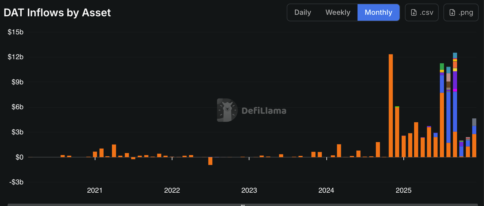 The shift from experiment to trend in 2025 was clear in the data: throughout the year, corporate treasury inflows into digital assets surged, with several months posting multi-billion-dollar net inflows, according to DefiLlama. August and September alone saw more than $23 billion flow into DATs.