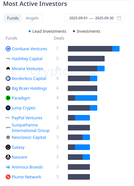 For September, Coinbase Ventures was the leading fund, involved in seven deals. Animoca Brands, a former leader, has diminished its investment footprint.
