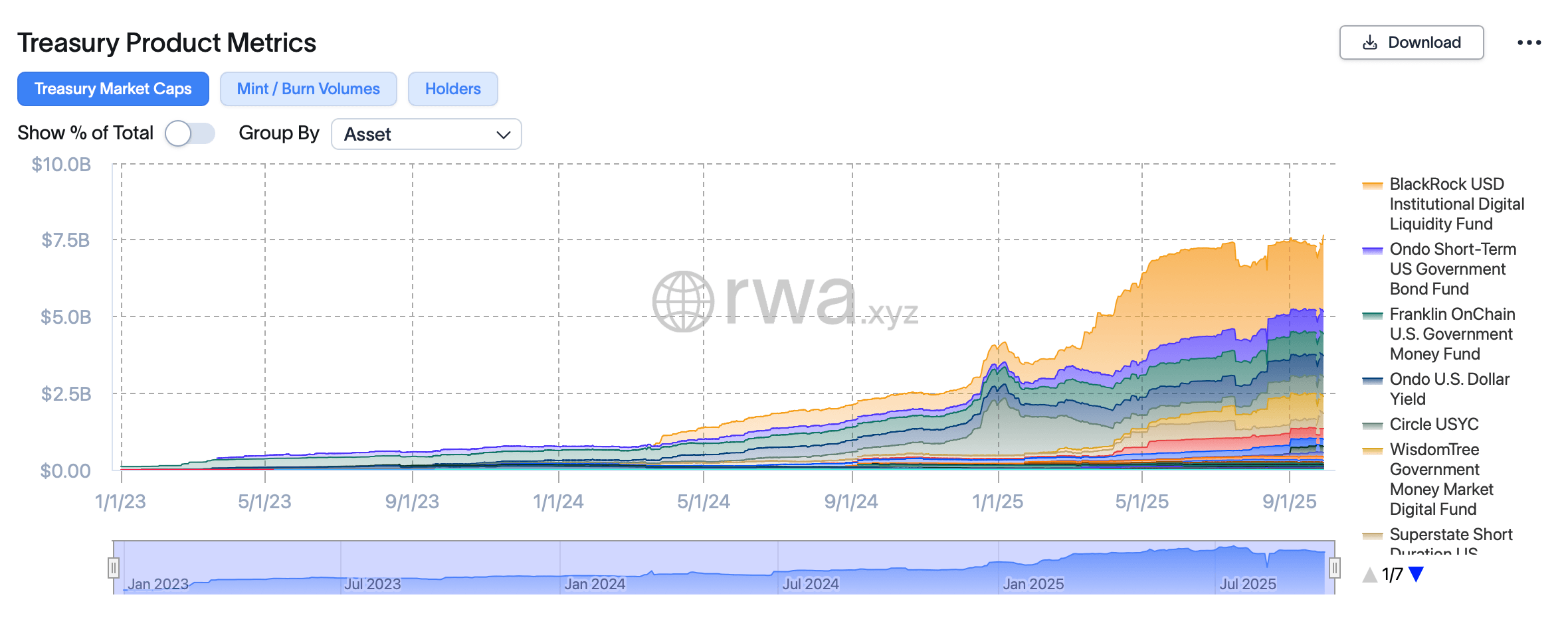 Current rwa.xyz data shows $7.65 billion in value, up 4.87% week over week, with average yield to maturity at 3.95%. There are 52,484 holders, down 1.08% on the week, hinting that larger tickets drove it. It is a concentrated market that keeps attracting traditional finance (TradFi) managers building on public rails.