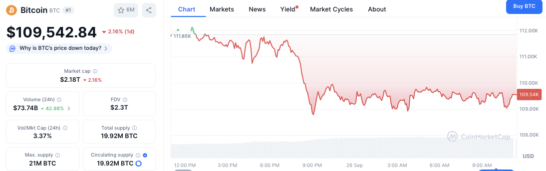 Ahead of the release, Bitcoin fell 2.16% over the past 24 hours to $109,542, according to CoinMarketCap. The asset touched $111,850 before reversing in late trading, with the decline pushing its market capitalization to $2.18 trillion.